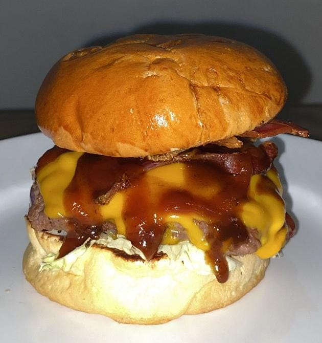 Pão, hamburguer smash, mussarela, bacon, alface, tomate, molho.