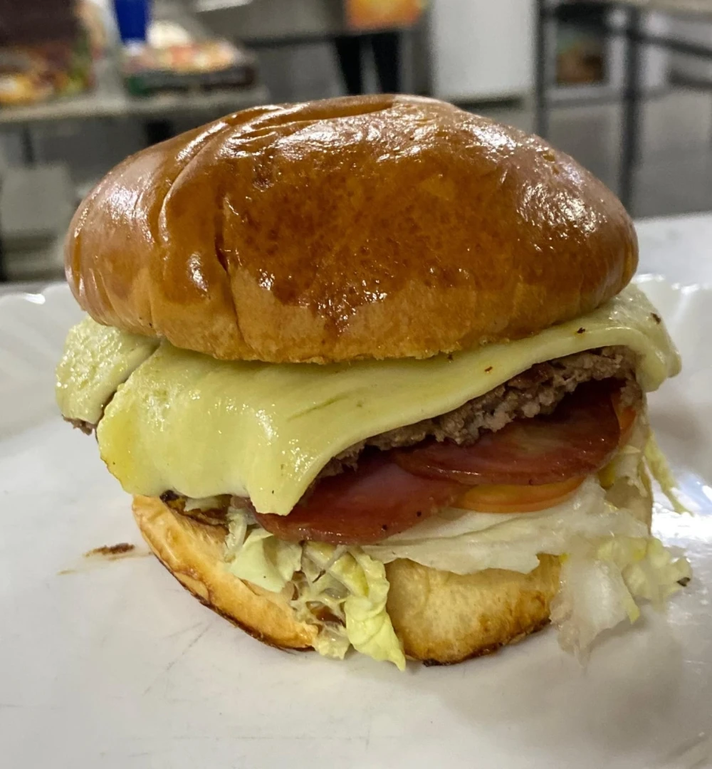 Pão, hamburguer smash, mussarela, cebola dourada, alface, tomate, molho.